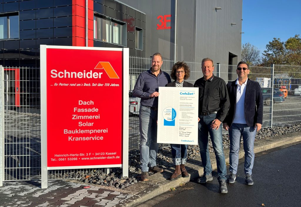 Kassel, 04. November 2025 – Die Schneider Dach GmbH, eines der führenden Dach- und Fassadenunternehmen in Nordhessen, wurde offiziell mit dem Bonitätszertifikat (CrefoZert) der Creditreform Kassel ausgezeichnet. Das Zertifikat ist bis Oktober 2026 gültig und bestätigt die wirtschaftliche Stabilität und die zuverlässige Unternehmensführung von Schneider Dach.